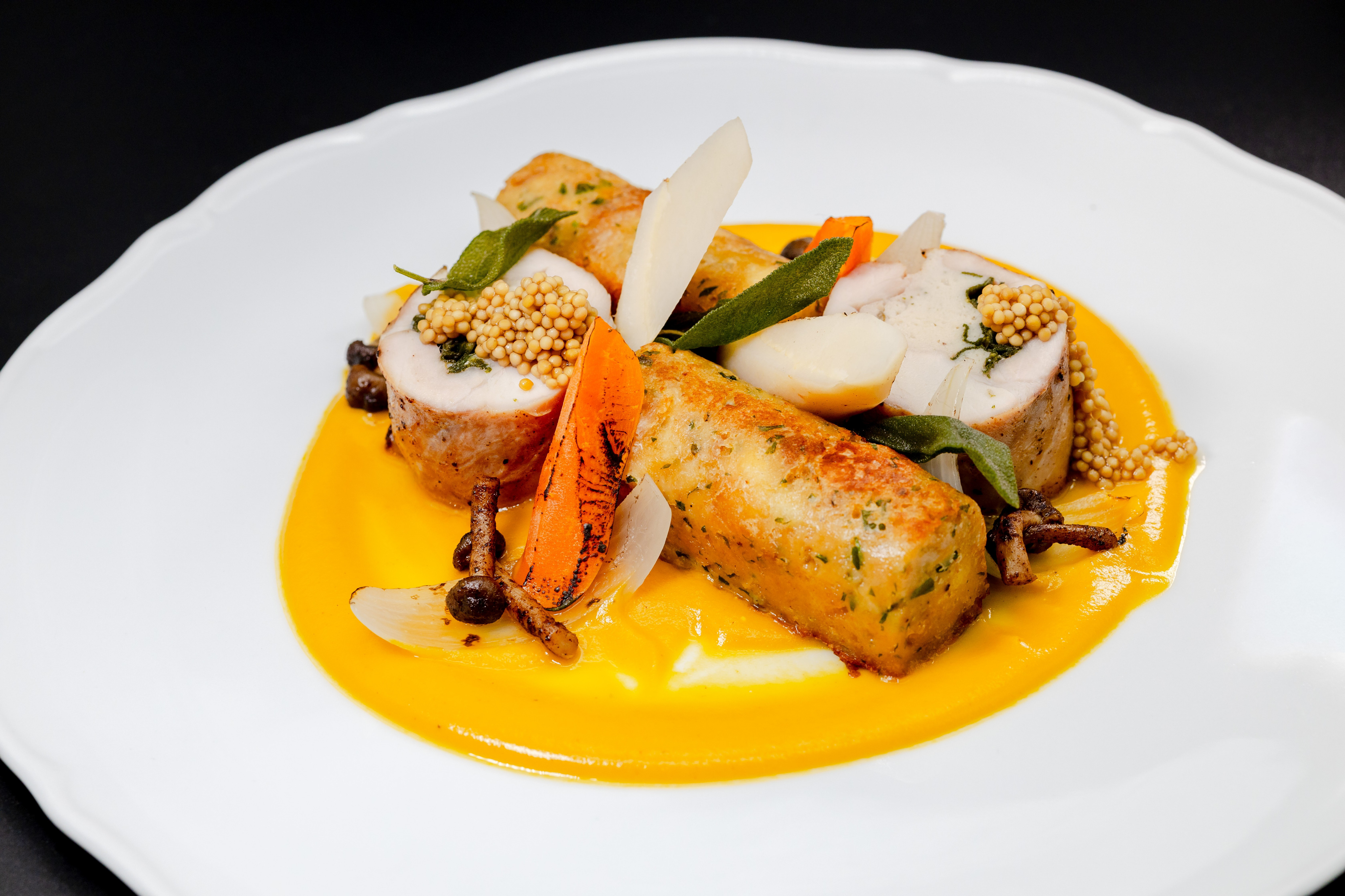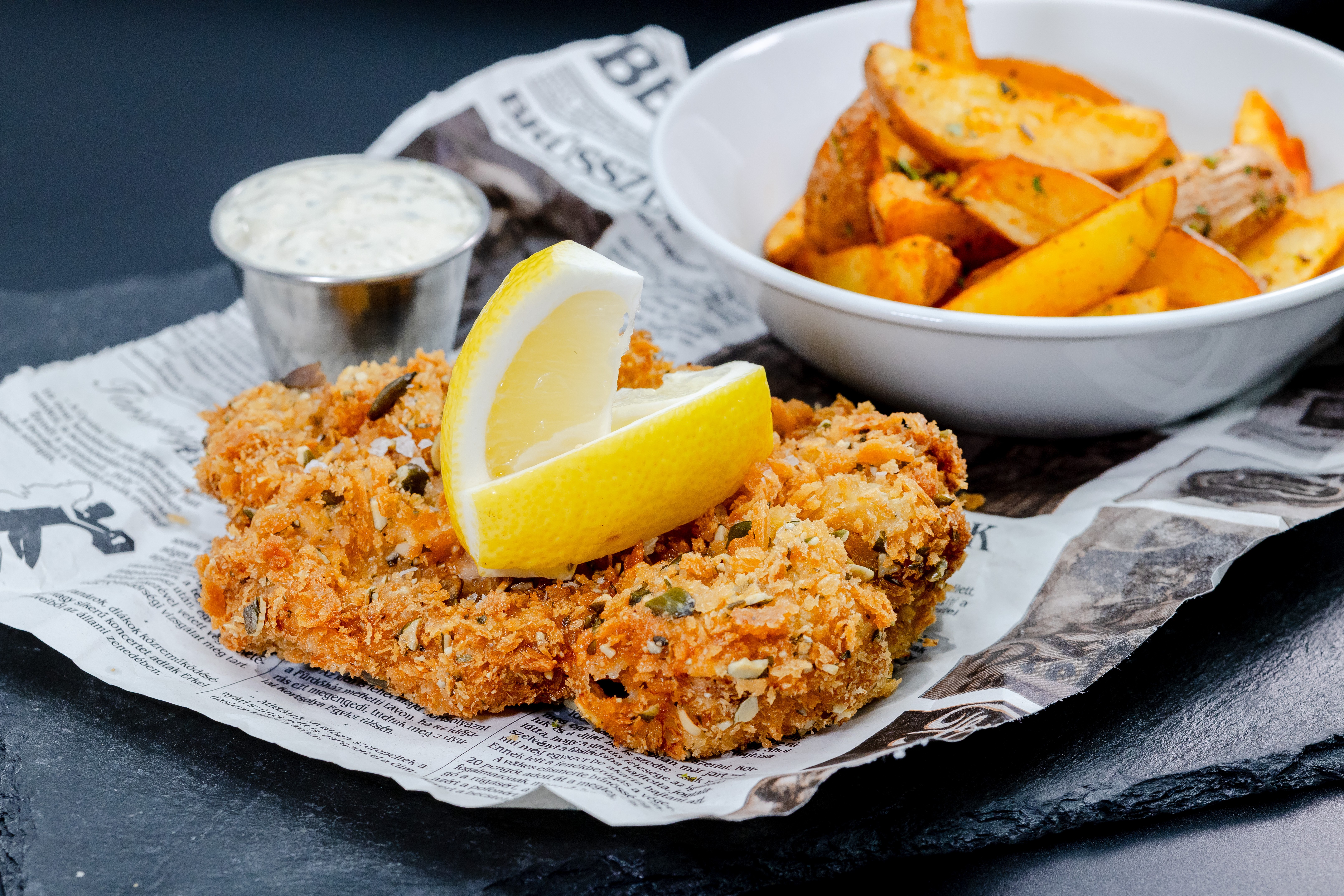 Rántott tarja, tökmagos bunda, zelleres remoulade, fűszeres burgonya