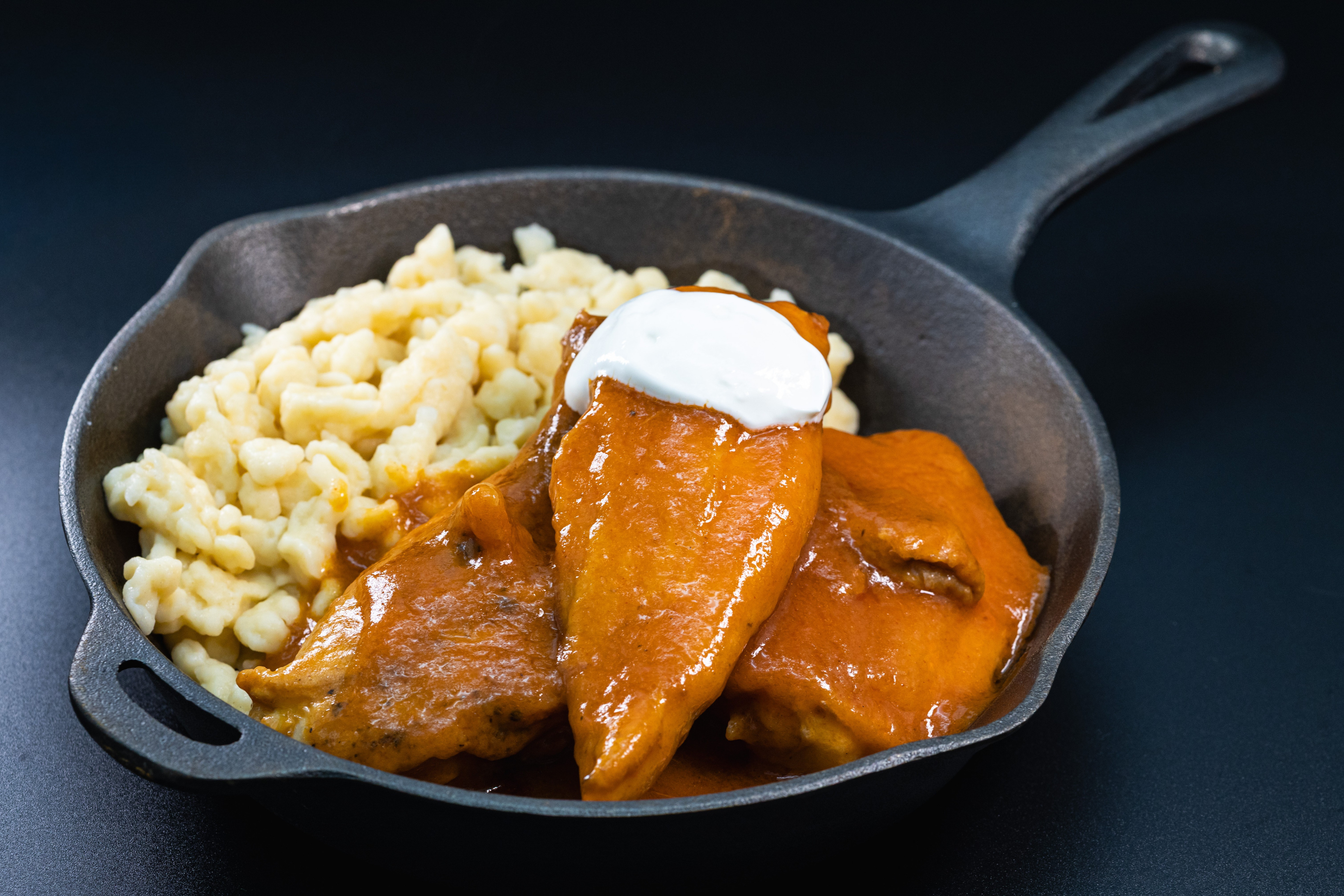 Csirkepaprikás, tojásos galuskával és uborkasalátával